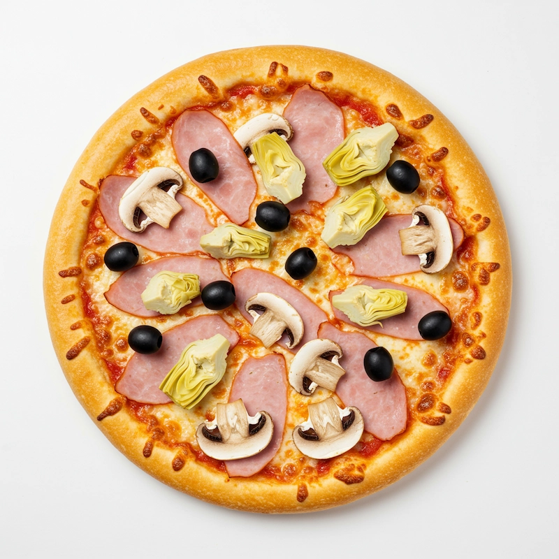 Ein italienischer Klassiker bei The Big Bite: Belegt mit Schinken, Champignons, Artischocken und schwarzen Oliven auf Tomatensauce und Mozzarella – herzhaft, abwechslungsreich und voll im Geschmack.