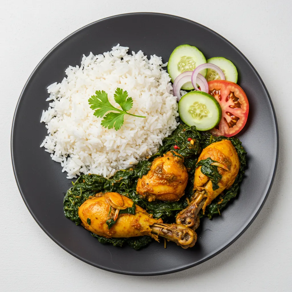 Hähnchenfleisch, Basmati-Reis oder Brot, Salat, scharfe TomatensoBe G