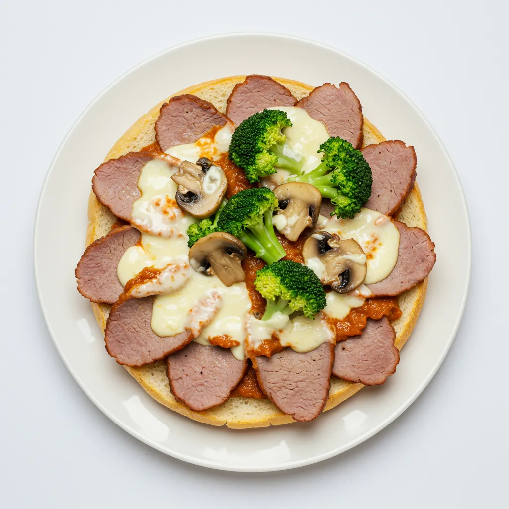 Kalbfleisch, Brokkoli, Pilze, Tomatensahnesoße, Käse, überbacken