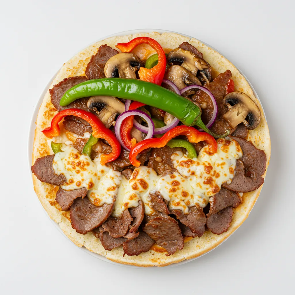 Kalbfleisch, Paprika, Zwiebeln, Pilze, Tomatensahnesoße und Käse, überbacken
