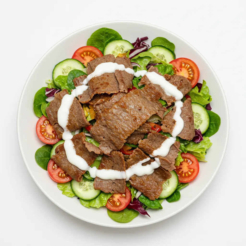 Knackiger Salat mit saftigem Kalbfleisch vom Drehspieß – herzhaft, frisch und perfekt abgeschmeckt.
