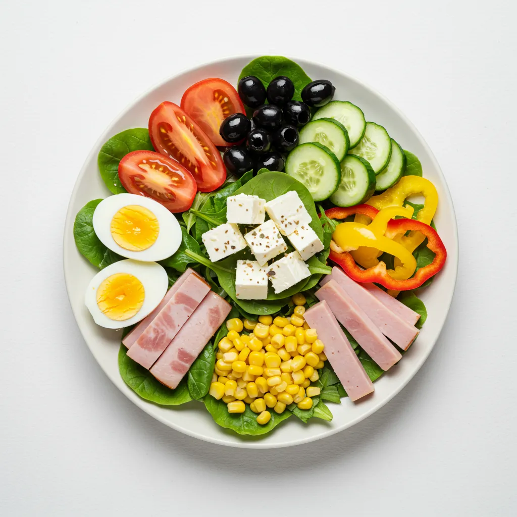 Tomaten, Gurken, Ei, Schinken, Oliven, Mais, Feta-Kase, Paprika CN49